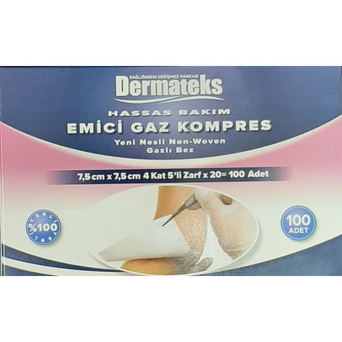Dermateks Hassas Bakım Gaz Kompres, 4 katlı non-woven yapısı ile yara bakımında yüksek emicilik ve hassas temizlik sağlayan medikal bir üründür. 7,5x7,5 cm ölçüsü ile standart pansuman uygulamalarına uygun olup, zarflı yapısı sayesinde hijyenik kullanım sunar.