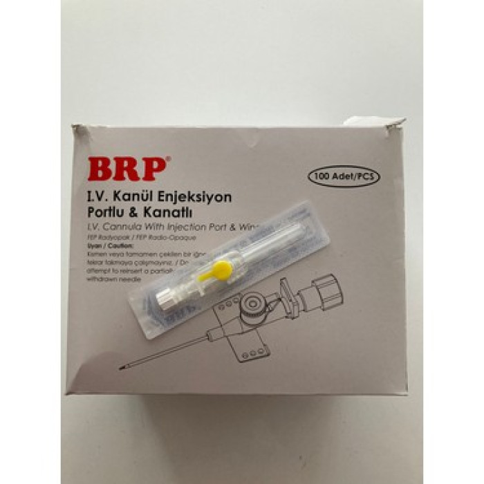 BRP IV Kanül Sarı 24G Portlu 100’lü, damar içi sıvı ve ilaç uygulamalarında kullanılan, portlu yapısı sayesinde ek enjeksiyon imkanı sunan steril bir medikal üründür. 24G ince çaplı yapısı ile hassas damarlar için uygun olup, 100’lü paket ile ekonomik kullanım sağlar.